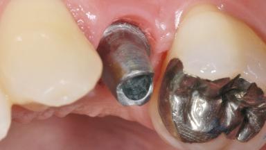 In 2004, a 36-year-old male patient, a non-smoker, presented due to acute pain in the premolar region of the upper left jaw. An orthopantomograph revealed that tooth 24 had been endodontically treated. It also became evident that, during root-canal filling,endodontic filling material had been pushed beyond the apex. This material was located very close to the maxillary sinus floor. Due to this finding in combination with the severe pain and a possible root fracture, tooth 24 was extracted. The esthetic expectations of the patient were not too high and his individual esthetic risk profile summed up to a medium risk profile.