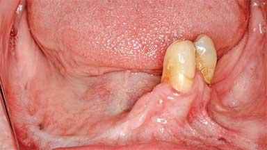A 77-year-old woman was referred to our department by an oral and maxillofacial surgeon for rehabilitation of her dentition. She had been diagnosed with squamous cell carcinoma 6 months earlier and was treated surgically by right mandibular rim resection and local floor-ofmouth resection extending to tooth 33. No radiotherapy or chemotherapy had been considered necessary. The patient complained that she was unable to eat and that her face was disfigured due to a lack of lip support on the resection side. She reported a history of well-controlled asthma and angina, in addition to cardiac arrhythmia and an allergy to penicillin. Her medication included acetylsalicylic acid and diltiazem.
