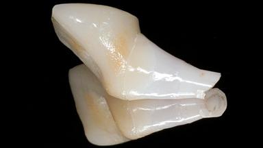 A 24-year-old female patient was treated with an implant- supported crown for single-tooth replacement at site 11. A Straumann Bone Level RC implant (Institut Straumann AG, Basel, Switzerland) was placed with simultaneous bone augmentation, and the periimplant emergence profile was conditioned with a fixed implant-supported provisional crown. After finalization of the mucosal architecture, the clinical situation was transferred by means of a custom impression post for fabrication of an implant-supported screw-retained onepiece crown consisting of a CARES® zirconia abutment (Straumann) with a direct ceramic veneer.