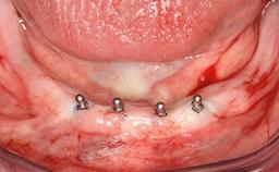 A 93-year-old female patient presented in September 2010 with an enlarged swelling on the lingual side of her lower incisors. At the time, she was essentially healthy, except for reduced vision due to bilateral age-related macular degeneration. She had been a heavy smoker (about 30 cigarettes a day) for the past 20 years after becoming a widow. The patient lived at home by herself, with full-time domestic support. An extraoral examination revealed nothing adverse. Intraoral plaque control was anything but ideal, and a soft-tissue tumescence was visible around the lingual aspect of 41–42. Because the nature of the lesion was not clear, a biopsy was carried out that revealed the inflammatory nature of the lesion. The panoramic radiograph showed six irregularly distributed mandibular implants supporting a full-arch prosthesis, with various degrees of interproximal peri-implant resorption. The periapical radiograph revealed interproximal bone resorption mesially and distally to implant 41.