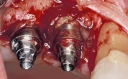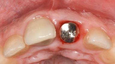 A 37-year-old male patient was referred to the Department of Periodontology at the University of Bern, Switzerland, by a private dentist. Tooth 21 had been lost due to trauma and had been replaced with an implant and a cemented single crown. The tapered-effect tissue-level implant had a diameter of 4.1 mm, a length of 12 mm, and a sandblasted and acid-etched (SLA) surface (Straumann Dental lmplant System; Institut Straumann AG, Basel, Switzerland). The metal-ceramic crown had been cemented permanently, leaving a submucosal gap between the implant shoulder and the crown margin. Absence of marginal bone loss apical to the polished transmucosal neck of the implant could be observed .