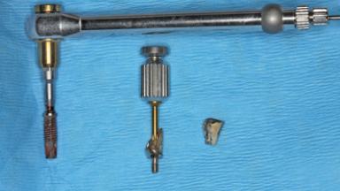 A 65-year-old female patient was referred to the periodontist for assessment and management of implant site 12. Implant 12 had been placed ten years previously and restored with a cemented single crown. The patient was a non-smoker in good general and periodontal health. On examination there were 7 mm probing depths at implant 12 with suppuration and bleeding on probing. The patient was aware of the presence of pus but had no discomfort. A periapical radiograph showed marginal bone loss to approximately the third thread of the implant. Previous radiographs obtained from the referring clinician indicated that there had been progressive bone loss since the implant was restored. A diagnosis of periimplantitis was made.