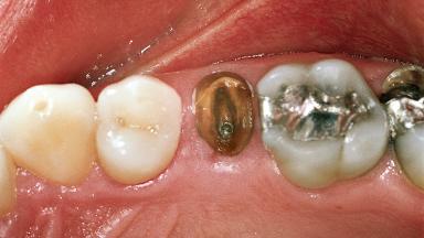 In February 2002, a 31-year-old non-smoking male patient was referred by his dentist after the fracture of the crown of the maxillary right second premolar, tooth 15. The fracture line was located apically to the gingival margin, particularly on the palatal side. Radiographic examination revealed the presence of a previous endodontic treatment with a non-ideal apical seal. There were no signs of periapical osteolysis. The level of the interproximal bone was normal. The patient’s medical history did not reveal any significant findings and he was in good general health.