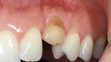 In October 1999, the 35-year-old female patient, a nonsmoker, presented at our clinic with a persisting deciduous canine 63 that displayed all the clinical signs and symptoms of an ankylosed primary tooth, including inadequate crown volume, discoloration, locally perturbed occlusal plane, inharmonious course of the associated soft tissue, advanced root resorption, and increased mobility. The patient had a strong wish for a durable improvement of the situation with a clear emphasis on dental/gingival esthetics. The patient was in good general health, and her medical history revealed no significant findings.