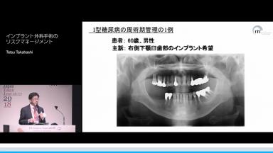 超高齢化社会の到来とともに有病者にインプラント治療を行う機会が増えている。演者は外科治療において注意しなければいけない基礎疾患(高血圧、糖尿病、坑血栓薬投与患者、副腎皮質ホルモン投与患者)の病態とリスクマネージメントの方法について紹介している。また、神経損傷や出血、感染など外科手術における合併症とその原因となる技術要因、環境要因、解剖学的因子について詳しく説明している。