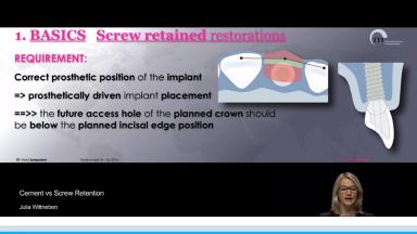 Dr. Wittneben also shares the results of clinical studies on the relationship of residual cement and margin position to the incidence of peri-implantitis. She outlines the research supporting the most recent ITI Consensus Statements related to screw vs. cement retention. This lecture concludes with clinical recommendations regarding the selection of a retention method.