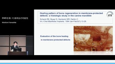 EMDは歯周病領域での応用が一般的であるが、本レクチャーでは骨再生への応用が紹介されている。拔歯直後での応用、顎骨頬舌径・高径の低下症例への応用などの症例が例示されており、さらに派生製品であるOsteogainの紹介も行われている。