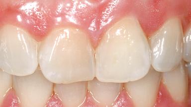 A 29-year-old female patient presented for treatment to replace the upper left central incisor tooth with an implant- supported restoration. The tooth had been intermittently symptomatic for the previous 12 months. The tooth had originally suffered trauma about 15 years previously. Several endodontic treatments had been performed, including an apicectomy procedure to retain the tooth. The patient was healthy and a non-smoker. She had reasonable expectations in regard to esthetic outcomes and the risk of marginal tissue recession following treatment. At medium smile, the gingival margins of the upper teeth were visible, with a display of 3 to 4 mm of the gingival margins. Gingival recession of tooth 21 and a discrepancy in the gingival levels between teeth 11 and 21 was observable during normal speech and smile.