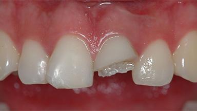 Assessment, treatment, and remarks on a Type 1 immediate implant replacement of an upper left central incisor with a vertical root fracture. A healthy, 21-year-old male patient presented with traumatic fracture of his upper left central incisor. The patient's gingival phenotype was classified as medium. The clinical image demonstrates the characteristics of a medium phenotype with long, thin dental papillae combined with thick attached gingival tissues. The tooth had both a vertical root fracture and a horizontal fracture of the crown, resulting in exposure of the pulp and loss of root integrity.