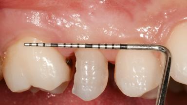 This 22-year-old female patient, a light smoker, came to the office in January 2007 because of a fracture of the endodontically treated tooth 15. The fracture had been caused by severe decay. The periapical radiograph revealed the full extent of the loss of tooth substance. The amount of healthy dentine was not sufficient for a stump preparation for a conventional crown due to the extent of decay and due to the fact that the fracture line extended below the bone level. Therefore, the patient was offered the following treatment options: Extraction of tooth 15 and gap closure with a conventional tooth-supported bridge, Orthodontic extrusion of tooth 15 and subsequent cementation of a conventional single crown and Extraction of tooth 15 and replacement by a dental implant.