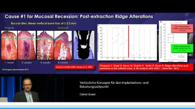 Prof. Buser berichtet in dieser Präsentation, die im Rahmen des Deutschen ITI Kongresses in Dresden im Jahr 2015 gehalten wurde. Langzeiterfolg von Implantaten über 20 Jahre, über den optimalen Implantation und Belastungszeitpunkt. Zunächst erläutert er die gewandelte Altersstruktur der Implantatpatienten und definiert die primären und sekundären Behandlungsziele in der Implantologie. Ein zentraler Aspekt der Präsentation stellt die Wahl des idealen Implantationszeitpunktes nach Extraktion mit Focus auf die verzögerte Sofortimplantation in Verbindung mit GBR dar, die auch mit einem informativen OP Video unterlegt ist. Er setzt sich kritisch mit dem Konzept der Sofortimplantologie auseinander und stellt die Ergebnisse der letzten ITI Konsensuskonferenz dar. Er definiert die Belastungszeitpunkte auf der Basis der ITI Konsensuskonferenz. In einem zweiten Schritt wird die Planung der Belastung in den Zusammenhang mit der Verlaufsbeurteilung der Implantatstabilität mittels ISQ Messung gestellt. Am Beispiel des Sinuslift mit primärer Implantation wird abschließend das Konzept eines flexiblen Belastungszeitpunktes auf Basis der ISQ Messung diskutiert.