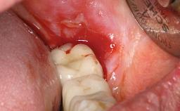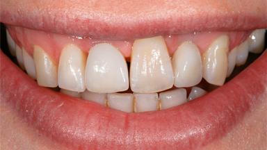 A male patient had lost teeth 11 and 22 as a result of a bicycle accident at age 14. In his adolescent years, a removable prosthesis had replaced the missing teeth. At age 21, the patient was referred by his dentist to the university clinic for treatment of the missing teeth 11 and 22 with implants. He was in good health and a nonsmoker. The absence of teeth 11 and 22 over many years had led to significant atrophy of the alveolar ridge, particularly at site 11. As a first step, the alveolar ridge was augmented using a block graft to replace the lost bone. A Straumann SP implant (diameter 4.1 mm, length 12 mm; Institut Straumann AG, Basel, Switzerland) and a Straumann Narrow Neck implant (length 10 mm) were inserted in the correct location and axial position at sites 11 and 22, respectively, six months later. After three months of healing and subsequent reentry, the patient returned to the referring dentist to receive the prosthetic restoration. The patient was seen again six months after the restoration had been placed. The frontal view showed a high smile line, an irregular gingival profile, and a bluish-gray tinge to implant crowns 11 and 22 compared to the natural dentition.