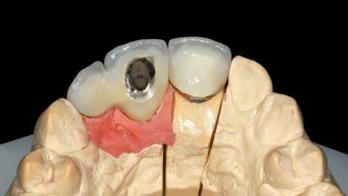 This 20-year-old woman was referred to our department in July 2006. Four months earlier, she had experienced dental trauma to the anterior maxilla when traveling in South America. The emergency treatment included emergency root canal treatment of teeth 12 and 11. Tooth 21 was also subjected to endodontic treatment later. At the initial examination, the patient was not in pain but reported increased mobility of tooth 12. The clinical examination revealed a high smile line, medium thickness of the soft tissue, and rectangular tooth forms. Discoloration of tooth 12 was evident. The periapical radiograph provided by the referring dentist indicated a fracture line at both teeth 12 and 11. A cone-beam computed tomography (CBCT) scan confirmed these fractures. No pathology was found to be associated with tooth 21.