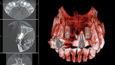 In November 2007, a 52-year-old woman presented with a failing restoration of the anterior maxilla in the form of a four-unit metal-ceramic fixed partial denture. As secondary caries had led to fracture of the abutment teeth bilaterally, the existing restoration could not be preserved. The patient was in good systemic health, and her medical history was without significant findings. Nor did the ensuing intra- and extraoral examination yield any significant findings. The patient had both a high lip line and high esthetic expectations. The preextraction findings suggested that no hard-tissue augmentation would be required before implant placement. After discussing the higher risk of immediate placement with the patient, she agreed to undergo “early implant placement after soft-tissue healing” simultaneously with guided bone regeneration (GBR) for hard-tissue augmentation.