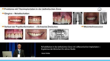 Diese Präsentation zeigt die Resultate einer klinischen Studie über ein Jahr bei vollkeramischen Implantaten in der Oberkieferfrontregion und erklärt die ästhetischen Herausforderungen bei Titanimplantaten im einsehbaren Bereich des anterioren Oberkiefers.