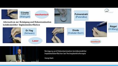 Diese Präsentation gibt einen Überblick zu den diversen Möglichkeiten der Reinigung und Dekontamination von keimbesiedelten Implantatoberflächen bei der Periimplantitistherapie. Dabei wird auf eigene in-vitro Studienresultate zu Kürretage, Pulverstrahleinsatz, Lasern (Er:YAG und Diode) sowie Ätzgel bei der Periimplantitistherapie eingegangen. Zudem werden die neueren Verfahren, photodynamische und auch photothermische Therapie (PDT und PTT), zur Periimplantitisbehandlung vorgestellt und deren Gemeinsamkeiten sowie Unterschiede aufgezeigt.